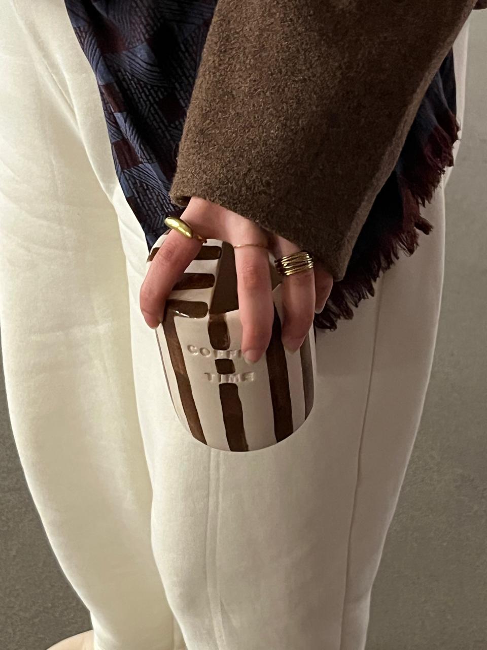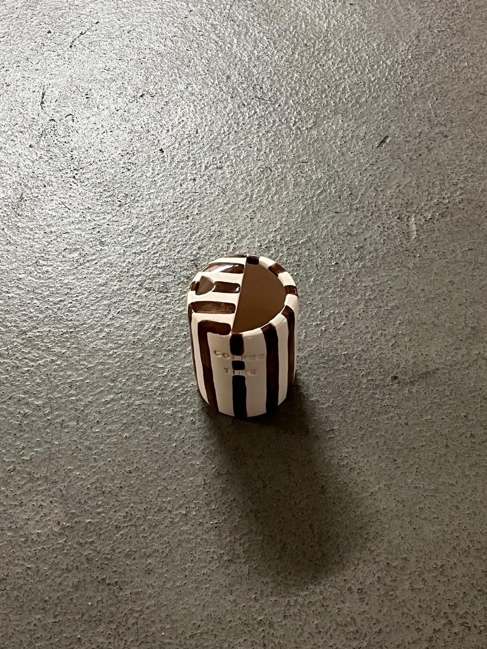 A unique handmade mug with a modern striped design that adds a warm, earthy touch to your coffee moments. Perfect for iced coffee and cold drinks, making it a refreshing choice for summer.